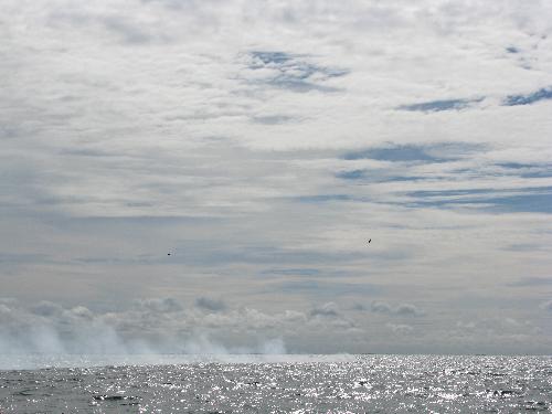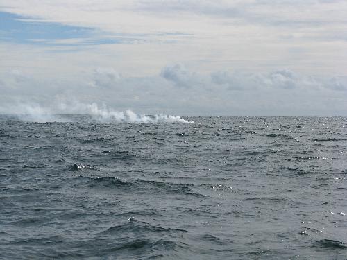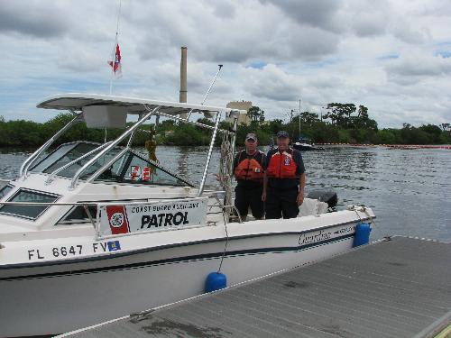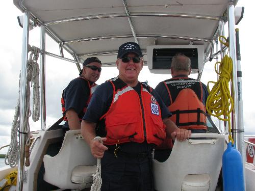 Guardian crew Harvey Prior Walter Murray Don Hoge on helm Guardian moored Anclote Park after unloading drop.